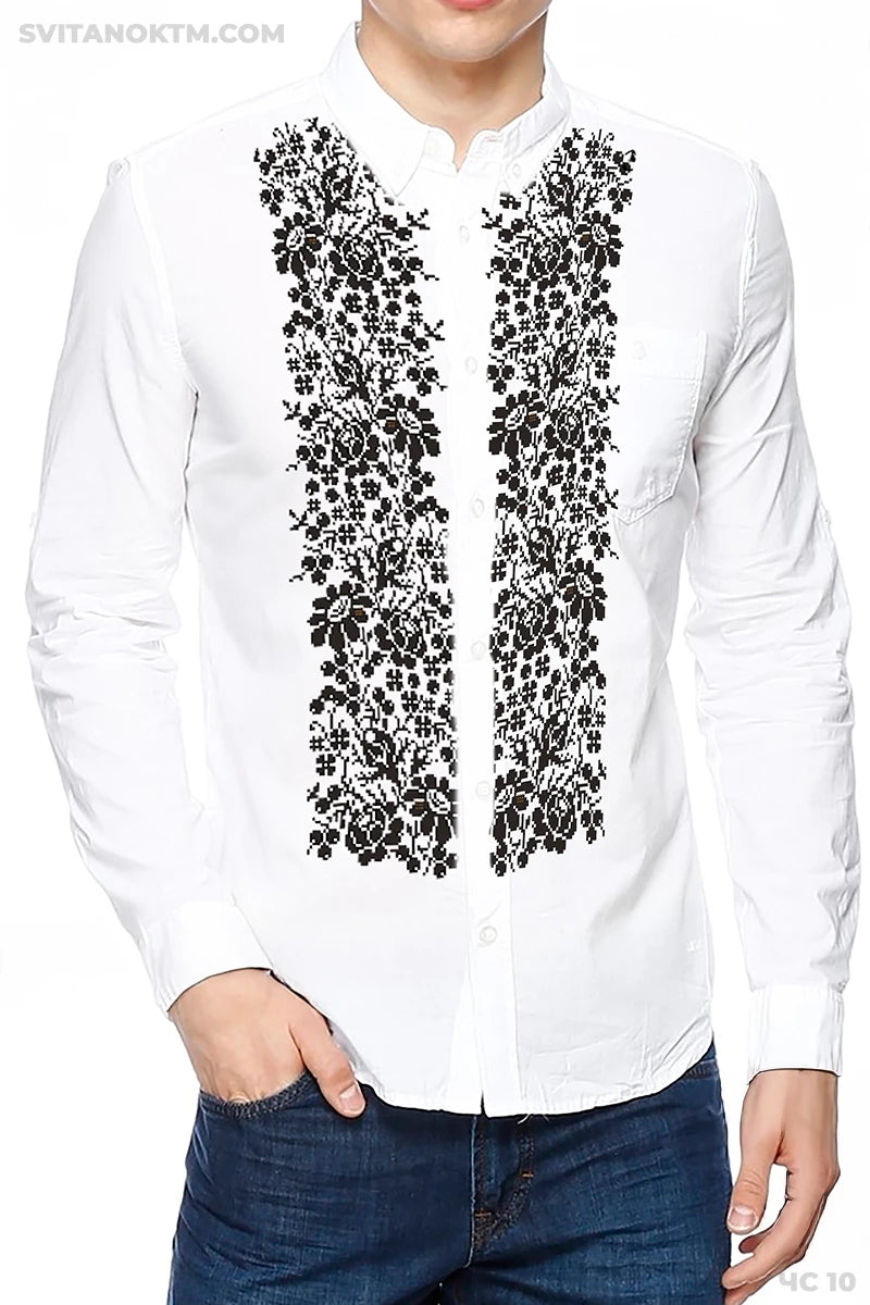 Чоловіча сорочка під вишивку з монохромним рослинним візерунком вздовж полички.