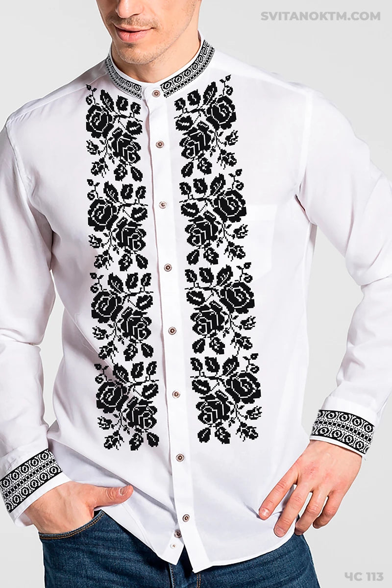 Не пошита заготовка для вишивки чоловічої сорочки з чорним квітковим орнаментом. Ідеальний варіант для створення унікальної чоловічої вишиванки у традиційному українському стилі. Підходить для вишивки бісером Preciosa або нитками DMC.
