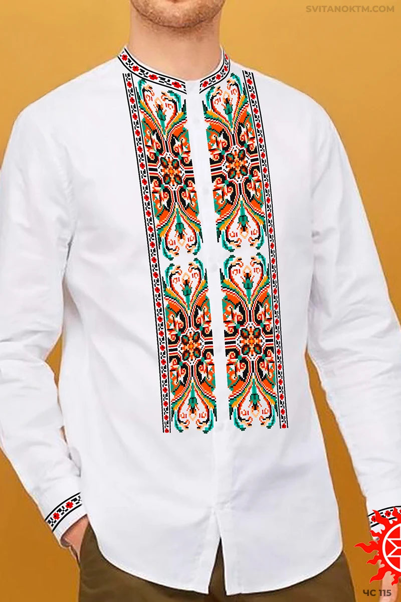 Чоловіча сорочка під вишивку. Головний акцент — вертикальна центральна доріжка з двома симетричними орнаментами, що поєднують геометрію та квіткові мотиви
