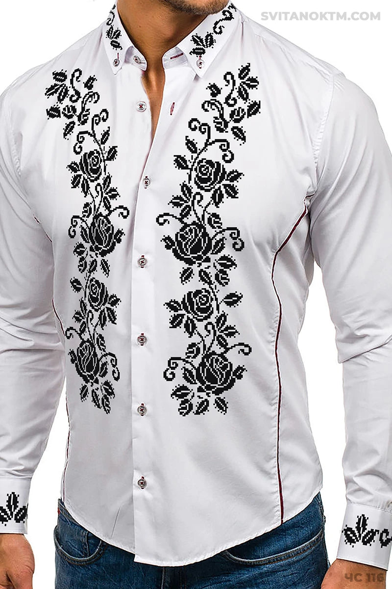 Чоловіча сорочка під вишивку. Головний акцент – пишні чорні троянди вздовж планки.