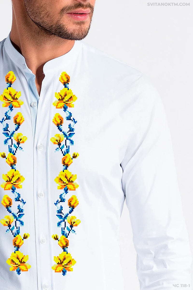 Чоловіча сорочка під вишивку. Дві вертикальні смуги вздовж планки з візерунком жовтих бутонів на синіх гілках.