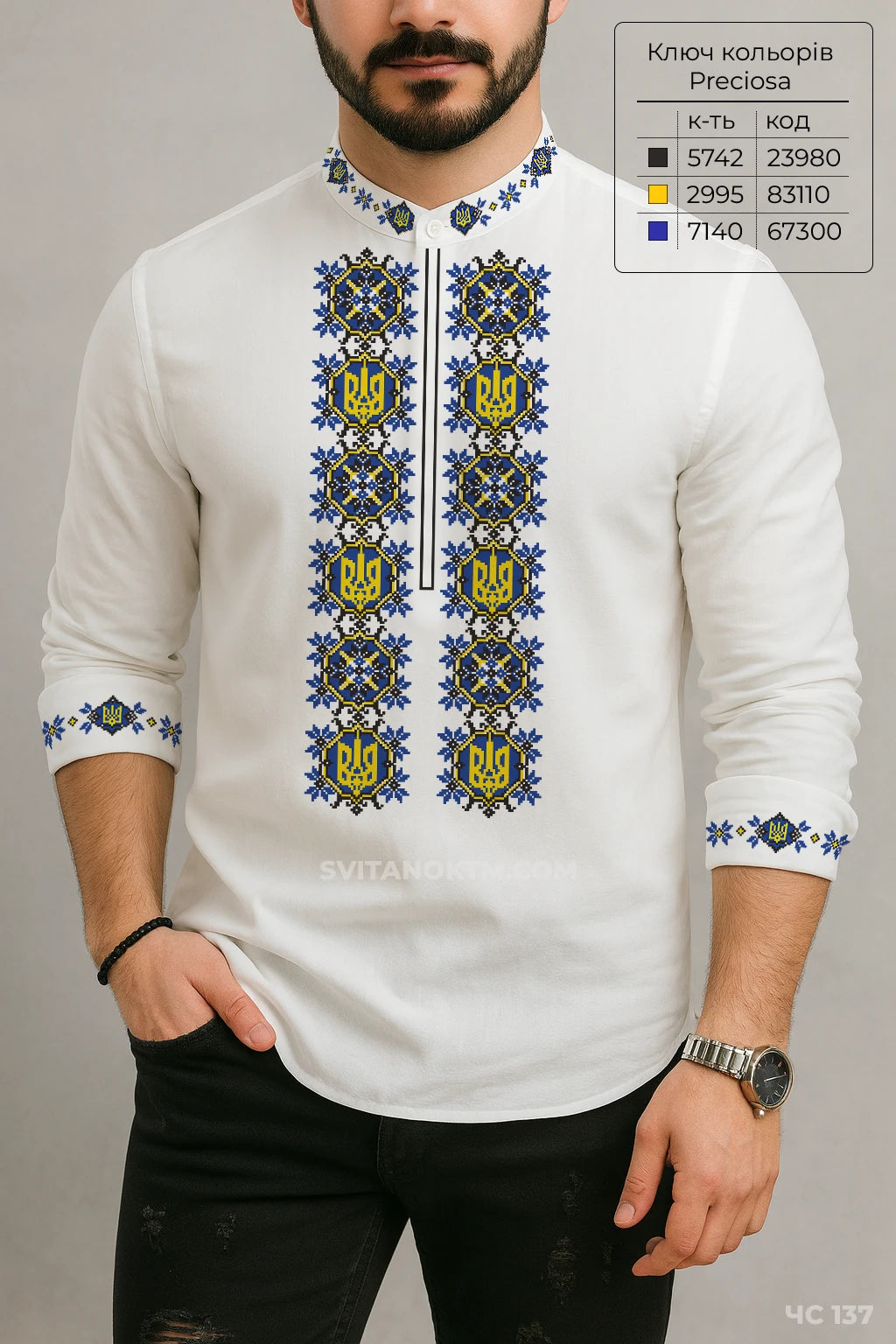Чоловіча сорочка під вишивку. Дві вертикальні смуги із тризубами по центру полички — символи державності й незалежності. Комір та манжети прикрашені синьо-жовтими геометричними мотивами з повтором тризуба.