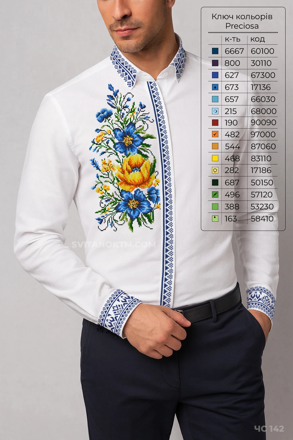 Не пошита аготовка для вишивки чоловічої сорочки з квітковим орнаментом . Ідеальний варіант для створення унікальної чоловічої вишиванки у традиційному українському стилі. Підходить для вишивки бісером Preciosa або нитками DMC.