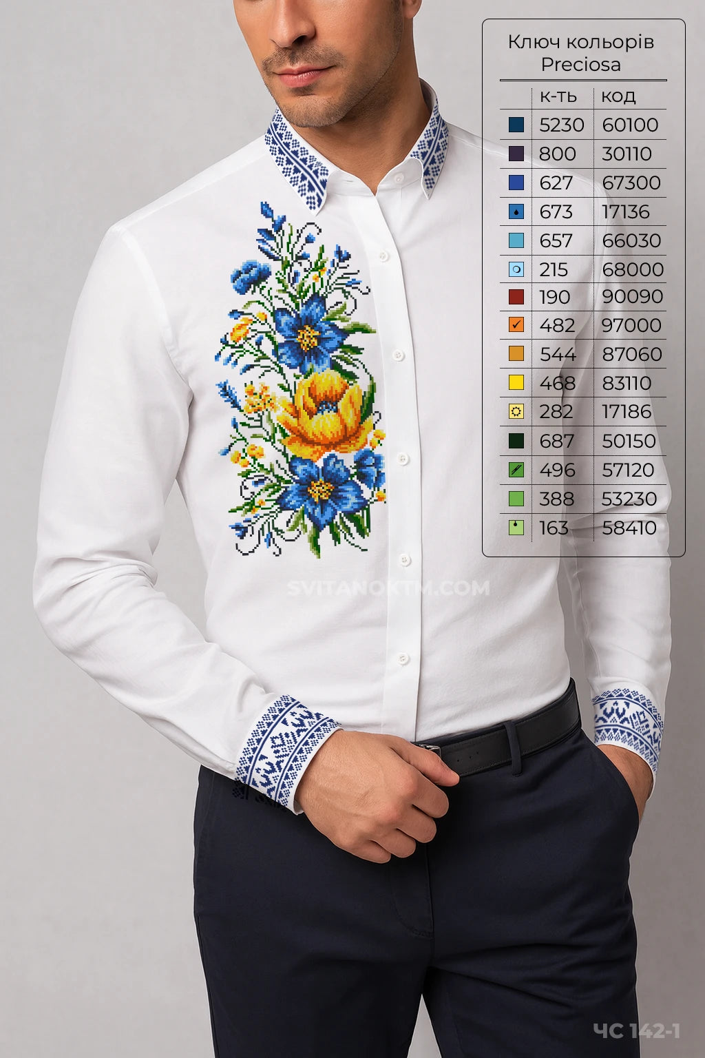 Не пошита аготовка для вишивки чоловічої сорочки з квітковим орнаментом . Ідеальний варіант для створення унікальної чоловічої вишиванки у традиційному українському стилі. Підходить для вишивки бісером Preciosa або нитками DMC.
