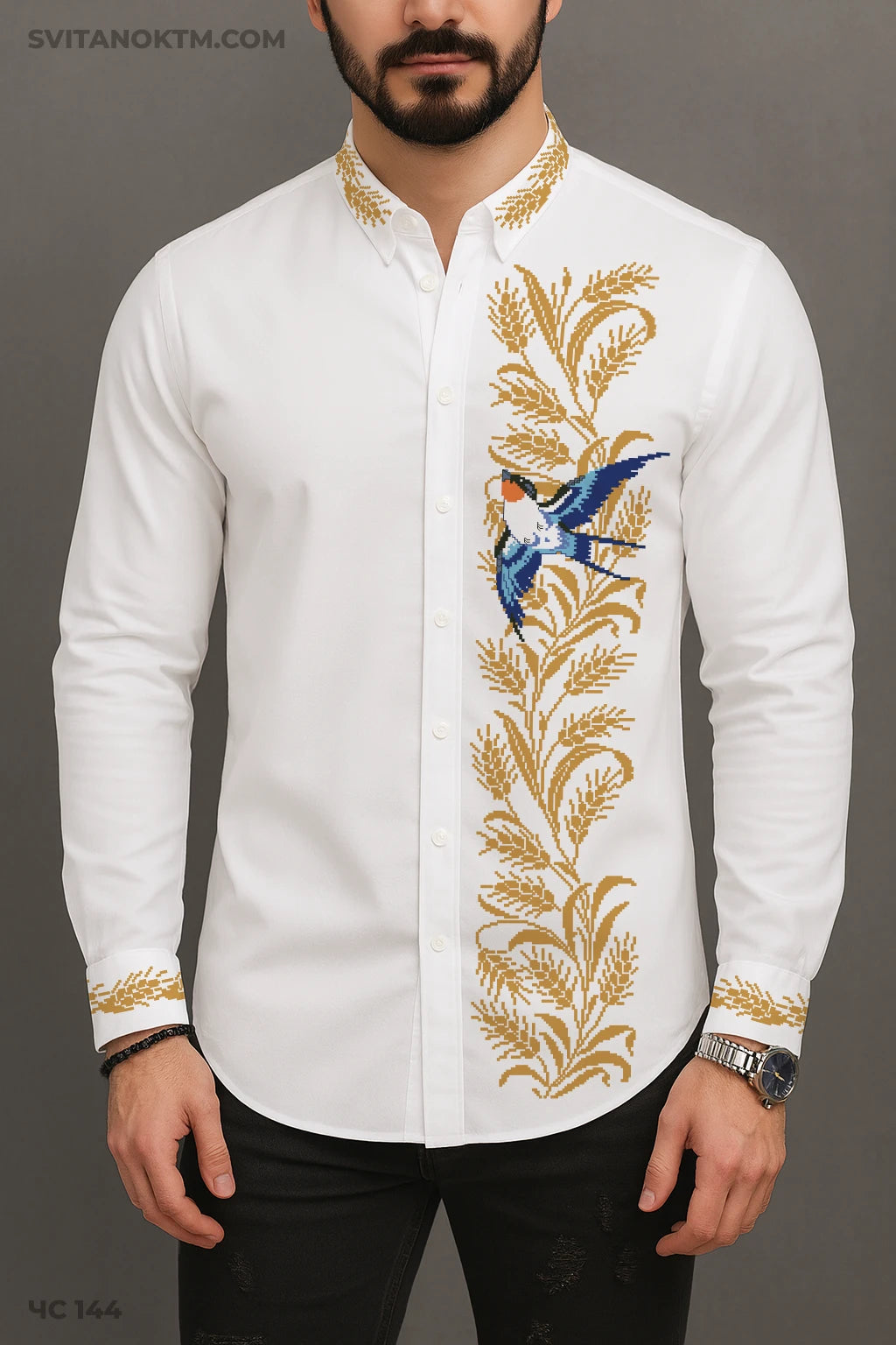 Не пошита заготовка для вишивки чоловічої сорочки прикрашена золотистим колоссям пшениці, що символізує достаток і родючість, та ластівкою — птахом миру, щастя й повернення додому. Підходить для вишивки бісером Preciosa або нитками DMC.