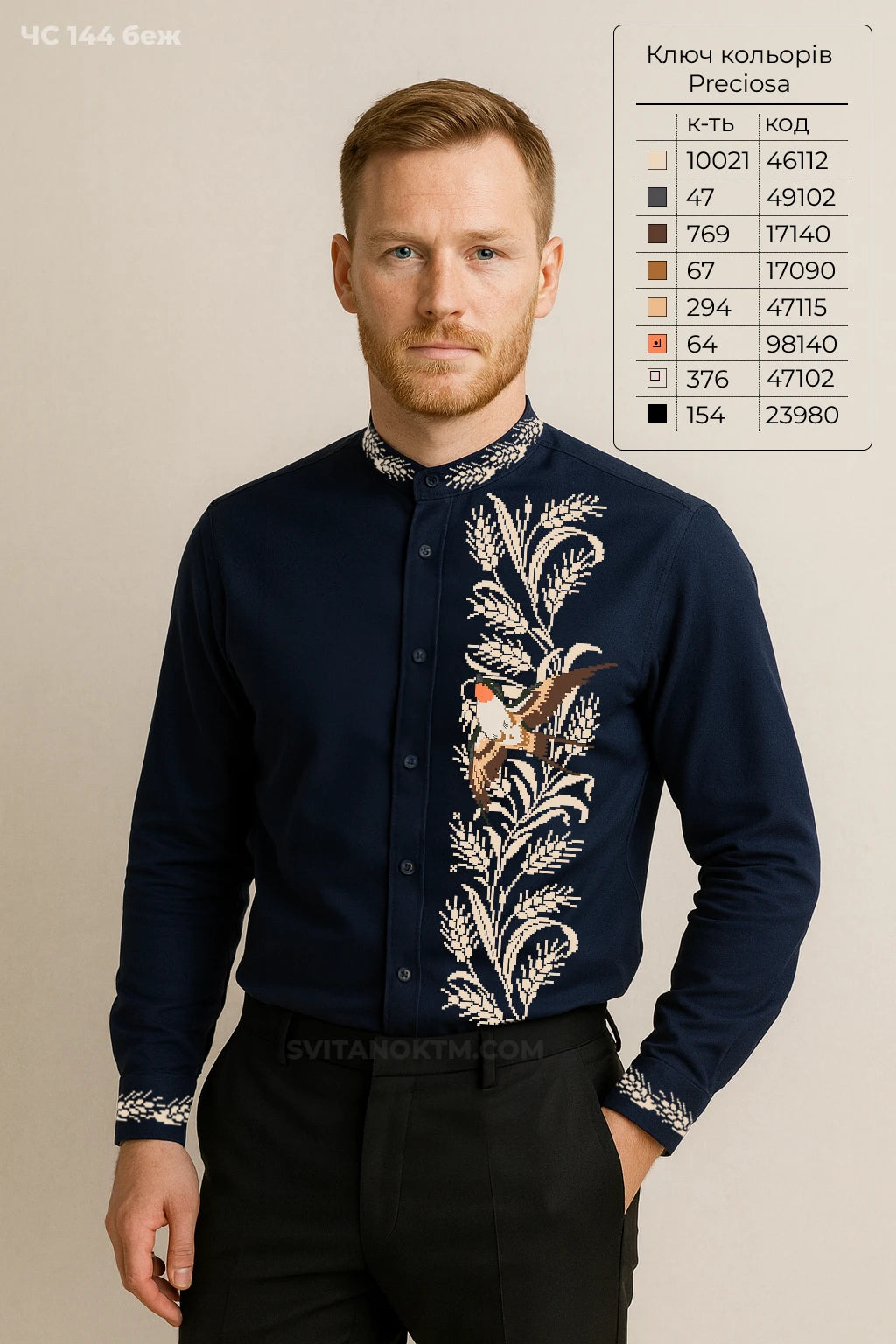 • Чоловіча сорочка під вишивку. Ластівка серед золотого колосся уздовж лівої планки. Комір і манжети декоровані стриманим рослинним орнаментом у тон до основного малюнка.
