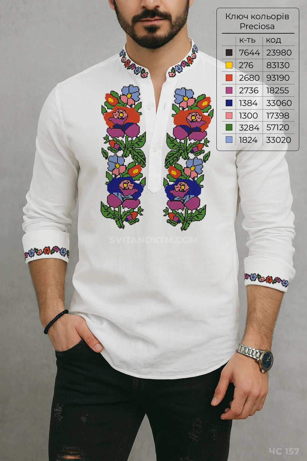 Не пошита аготовка для вишивки чоловічої сорочки з квітковим орнаментом. Ідеальний варіант для створення унікальної чоловічої вишиванки у традиційному українському стилі. Підходить для вишивки бісером Preciosa або нитками DMC.