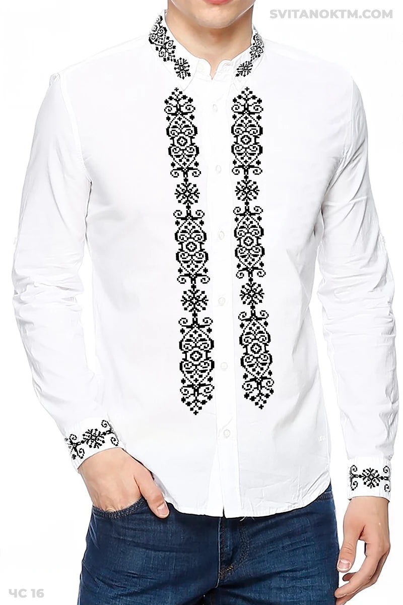 Чоловіча сорочка під вишивку. Чорний геометричний орнамент вздовж планки на манжетах та комірі.