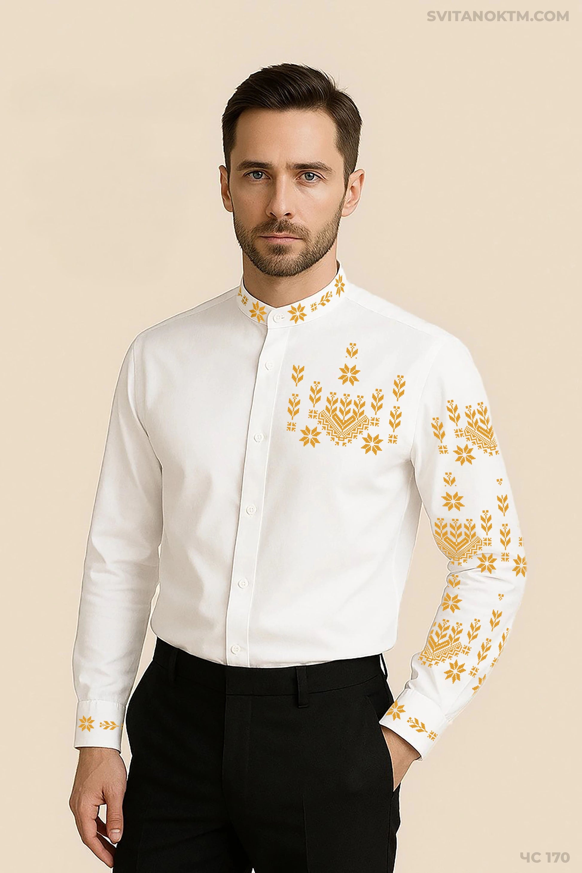 Чоловіча сорочка під вишивку. Орнамент із дрібних символів і стилізованих квітів розміщено на поличці, рукаві, манжетах і комірі-стійці.