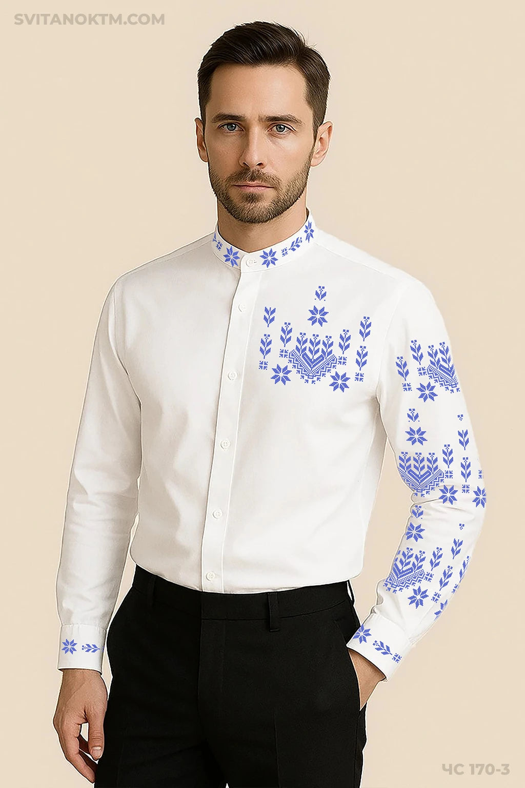 Чоловіча сорочка під вишивку. Геометричний узор із квітковими мотивами — унікальне поєднання традиційного й сучасного стилю. Вишивка на поличці, рукаві, комірі та манжетах.