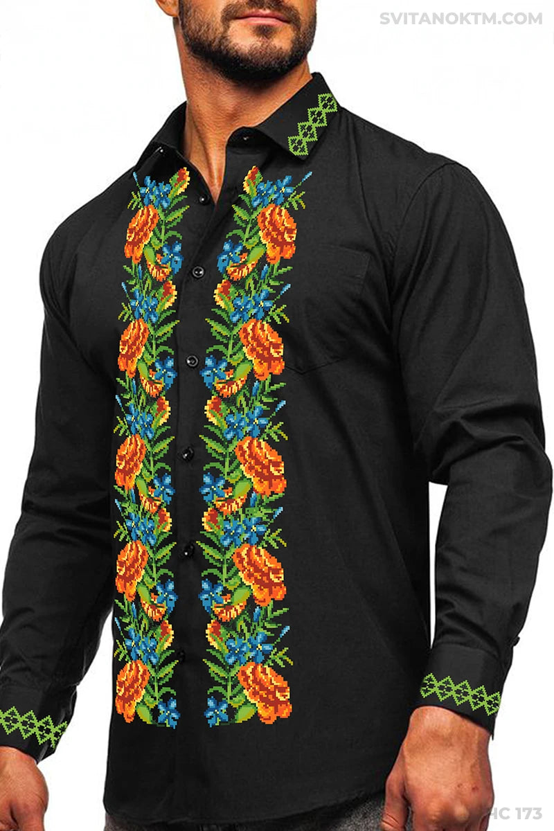 Чоловіча сорочка під вишивку. Подвійна вертикальна композиція чорнобривців і барвінку уздовж планки. Декорування коміра та манжет виконане традиційними геометричними елементами.