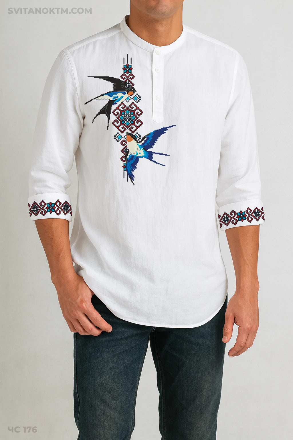Чоловіча сорочка під вишивку. Візерунок із двома ластівками та традиційними елементами вишивки. Манжети оздоблені стриманим геометричним узором у тих самих кольорах.