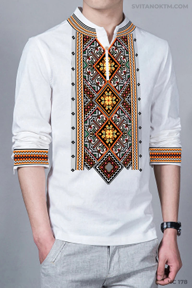 Чоловіча сорочка під вишивку. Головний акцент — симетричний орнамент із ромбів, що тягнеться вздовж грудей і закінчується трикутним елементом унизу. Комір-стійка та манжети виконані у гармонійному геометричному візерунку.
