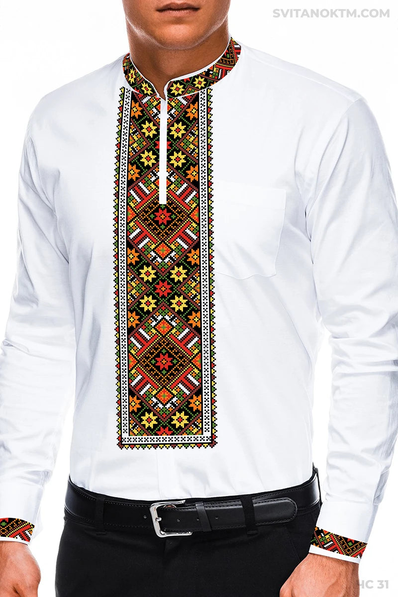 Чоловіча сорочка під вишивку. Головний орнамент — гуцульський ромбовий візерунок, що спускається від коміра до низу. Комір-стійка та манжети повторюють основний мотив, створюючи гармонійний ансамбль.