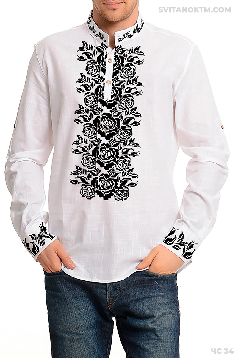 Чоловіча сорочка під вишивку. Головний акцент – монохромні троянди, розташовані на грудях і манжетах.