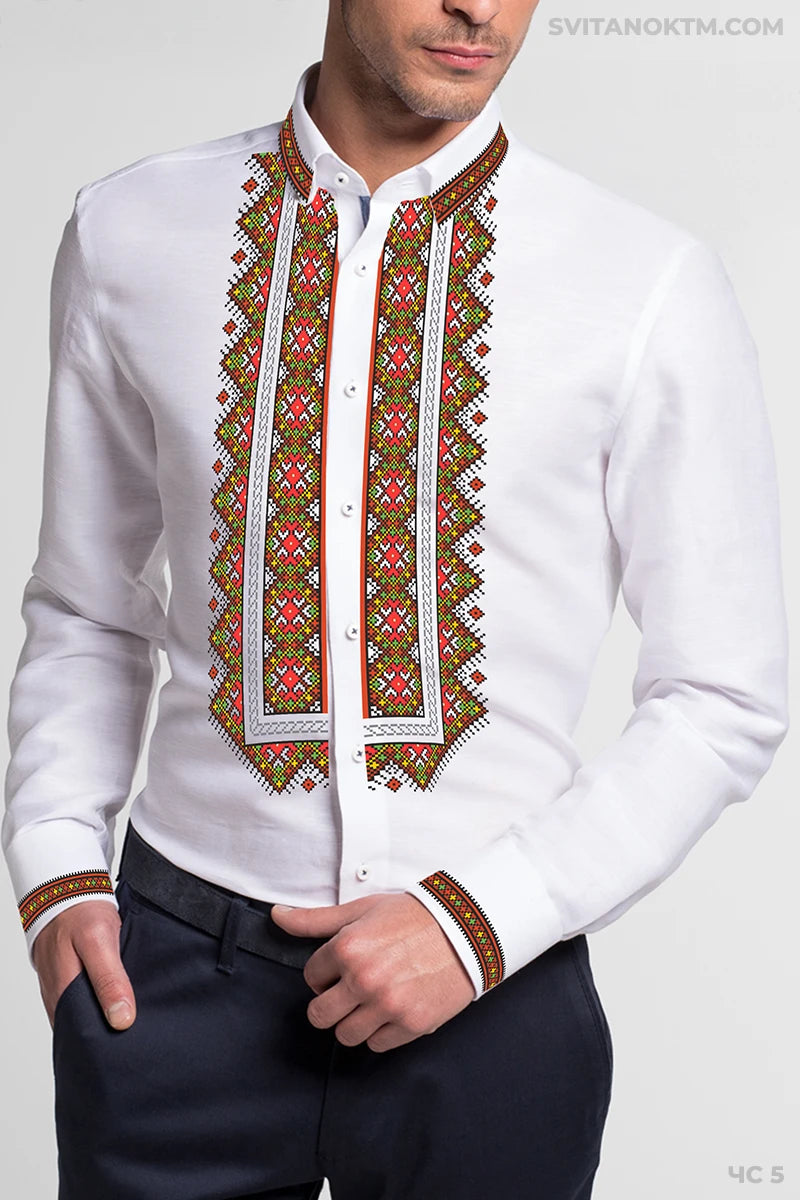 Чоловіча сорочка під вишивку. Вишуканий геометричний візерунок уздовж планки з плавним переходом кольорів. Комір-стійка та манжети прикрашені узором у тій самій гамі.
