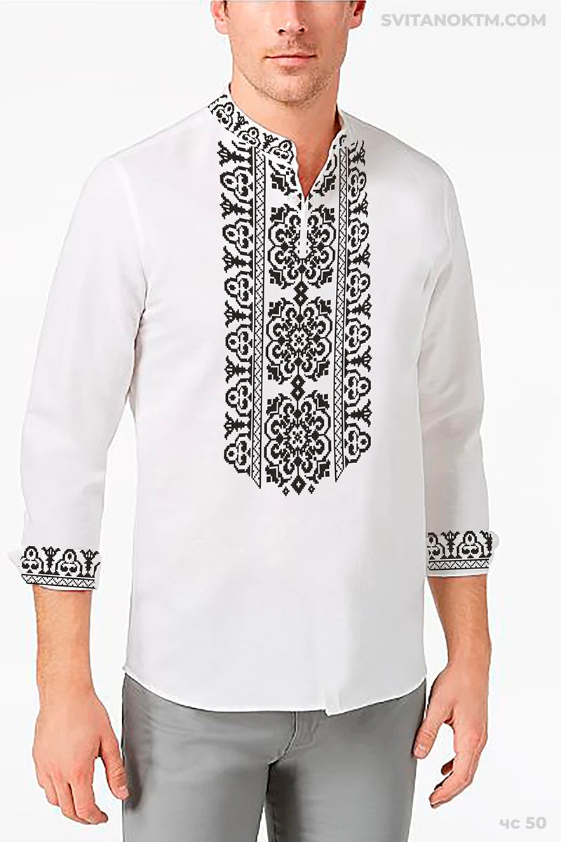 Не пошита заготовка для вишивки чоловічої сорочки з мінімалістичним орнаментом. Ідеальний варіант для створення унікальної чоловічої вишиванки у традиційному українському стилі. Підходить для вишивки бісером Preciosa або нитками DMC.