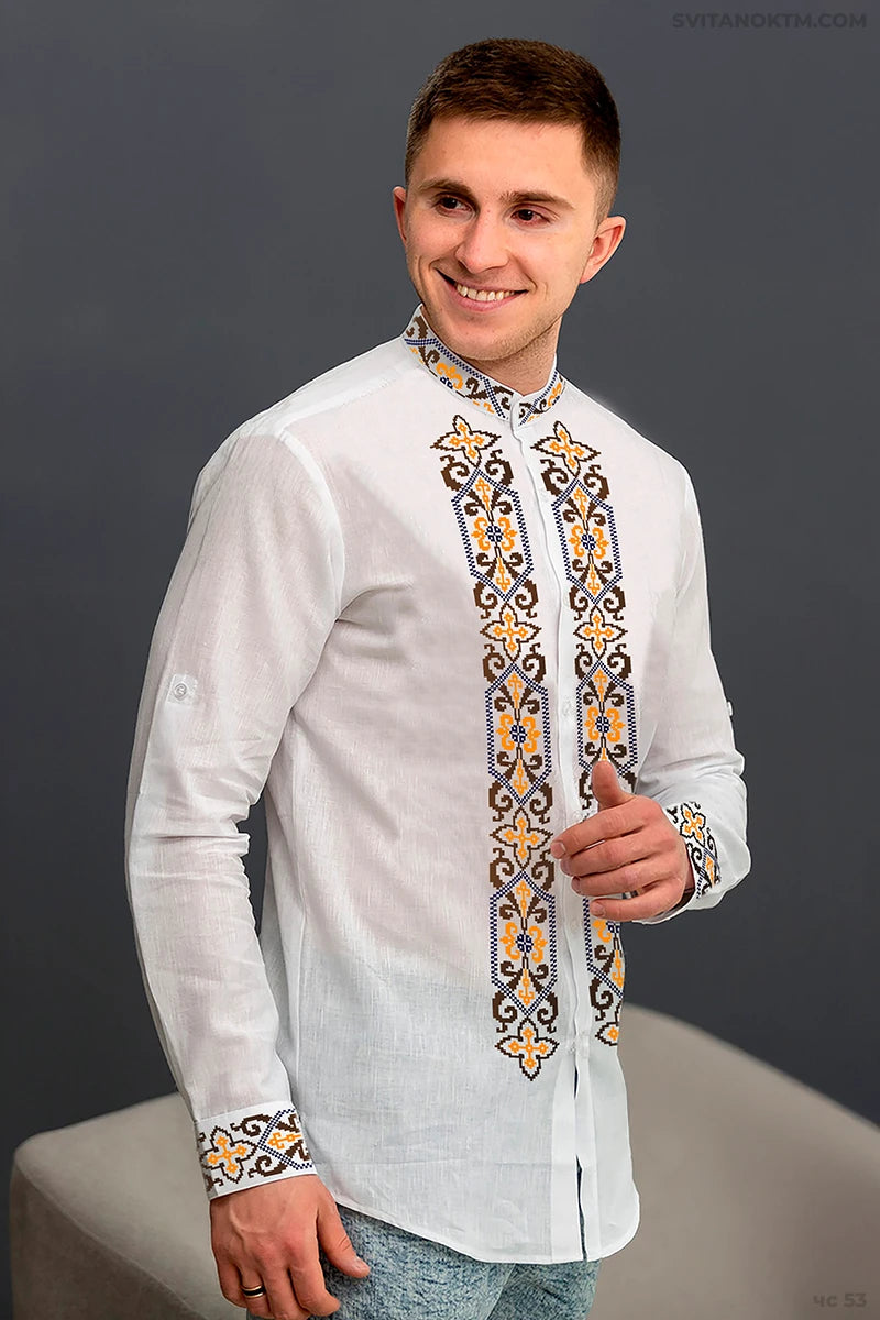 Чоловіча сорочка під вишивку. Вертикальна смуга геометричного орнаменту розташована по обидві сторони від планки. Декор манжет та коміра виконаний у тому ж стилі, створюючи гармонійний образ.