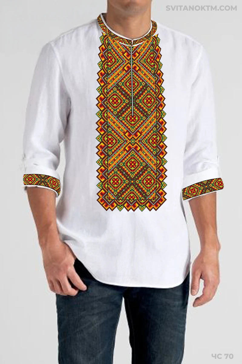 Чоловіча сорочка під вишивку. Головний орнамент — гуцульський ромбовий візерунок, що спускається від коміра до низу. Комір-стійка та манжети повторюють основний мотив, створюючи гармонійний ансамбль.