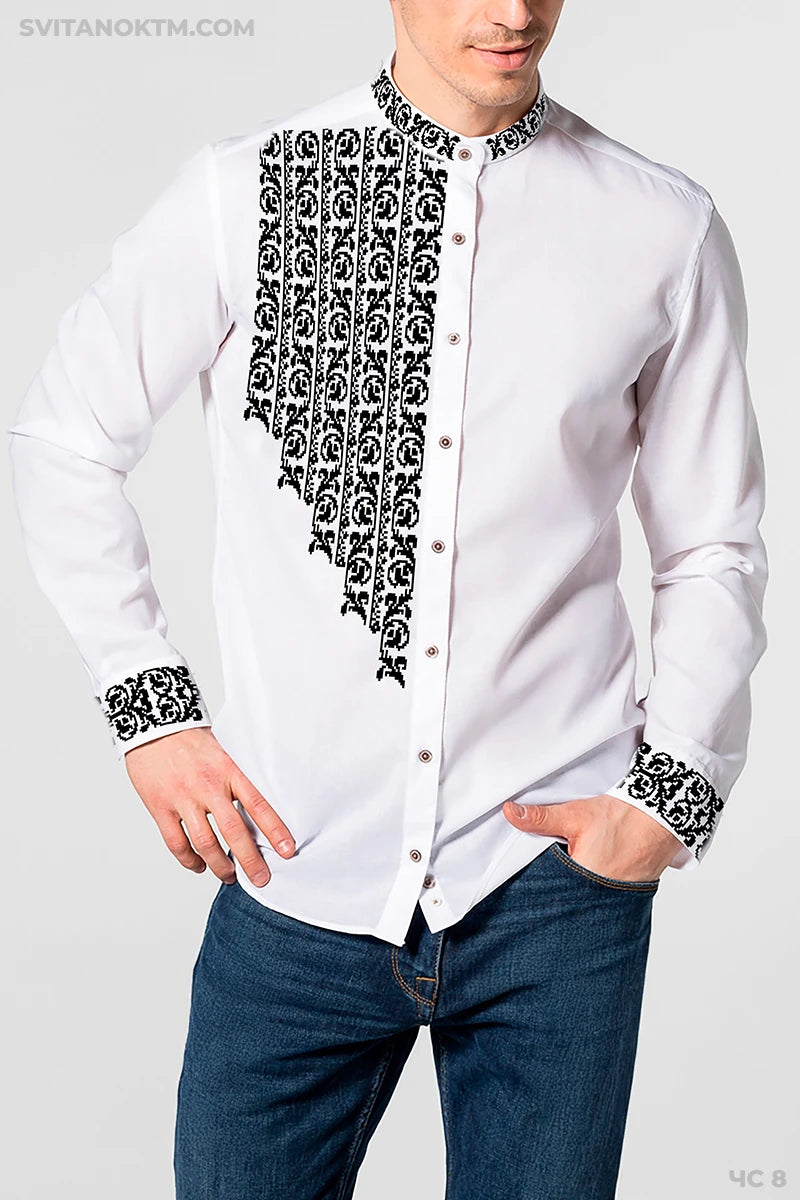 Чоловіча сорочка під вишивку. Каскад геометричного орнаменту вздовж планки.