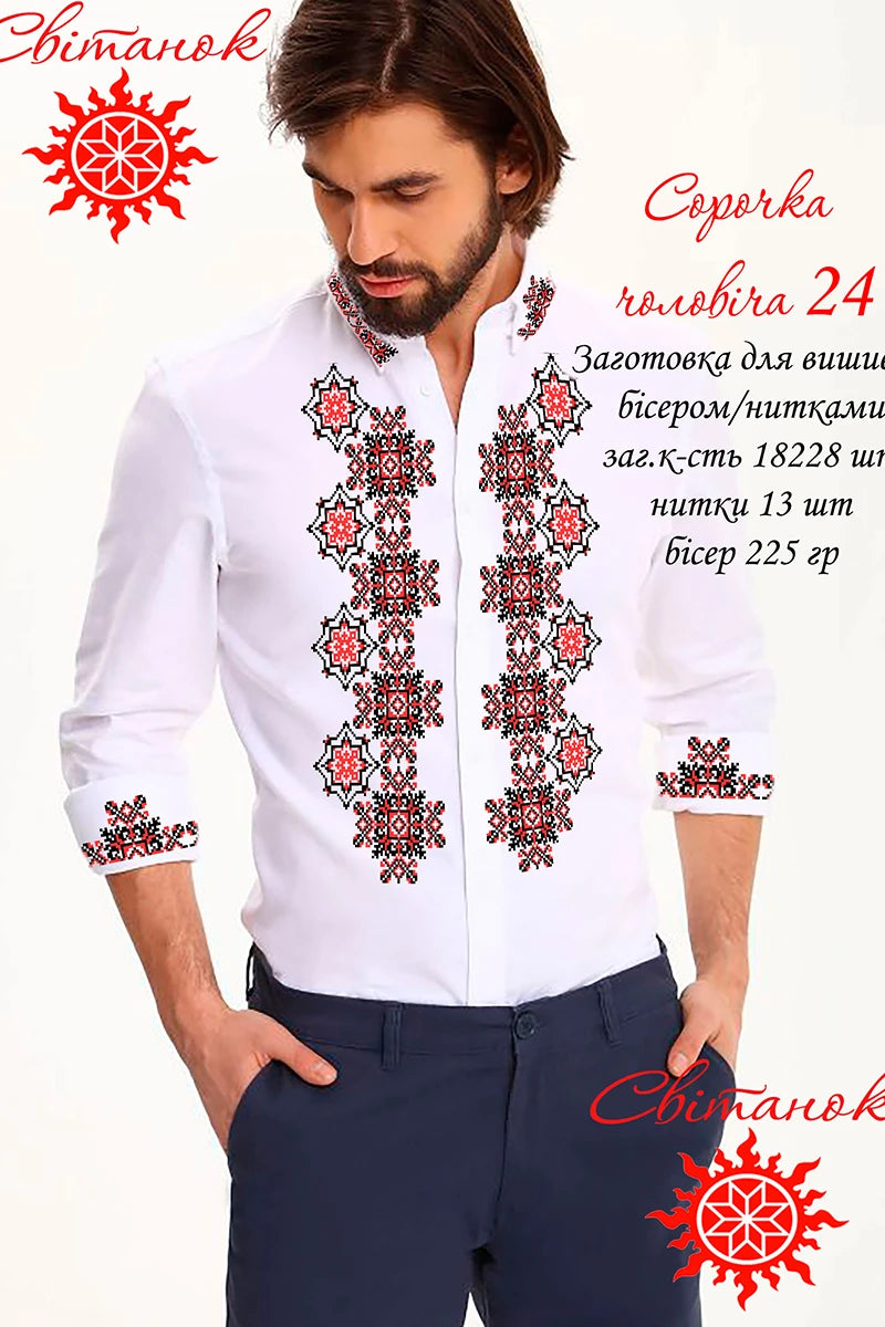 Не пошита заготовка для вишивки чоловічої сорочки. поєднання класики української вишивки та елегантного сучасного силуету. Основою орнаменту є традиційні восьмикутні зірки — символ гармонії, життєвої енергії та духовного світла. Їх виконано у червоно-чорній гамі, що є однією з найдавніших і найвиразніших комбінацій у народному вбранні. Ідеальний варіант для створення унікальної чоловічої вишиванки у традиційному українському стилі. Підходить для вишивки бісером Preciosa або нитками DMC.