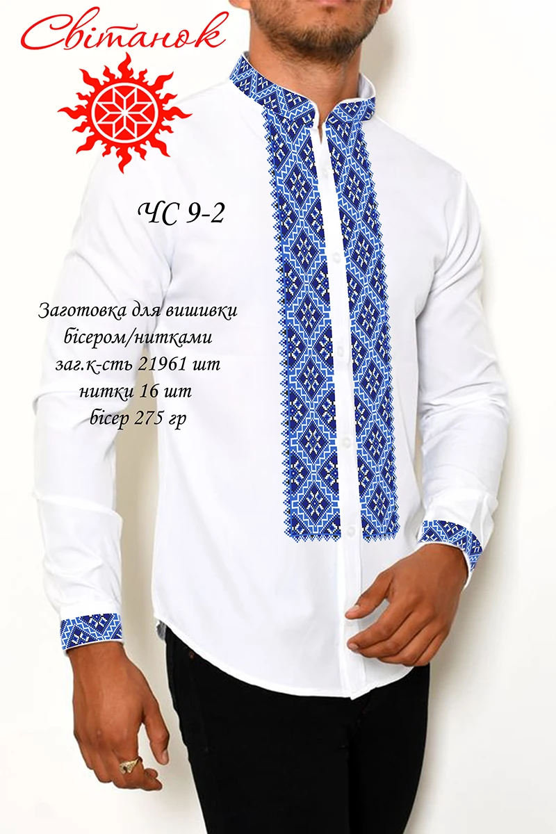 Не пошита заготовка для вишивки чоловічої сорочки з синім геометричним орнаментом. Ідеальний варіант для створення унікальної чоловічої вишиванки у традиційному українському стилі. Підходить для вишивки бісером Preciosa або нитками DMC.