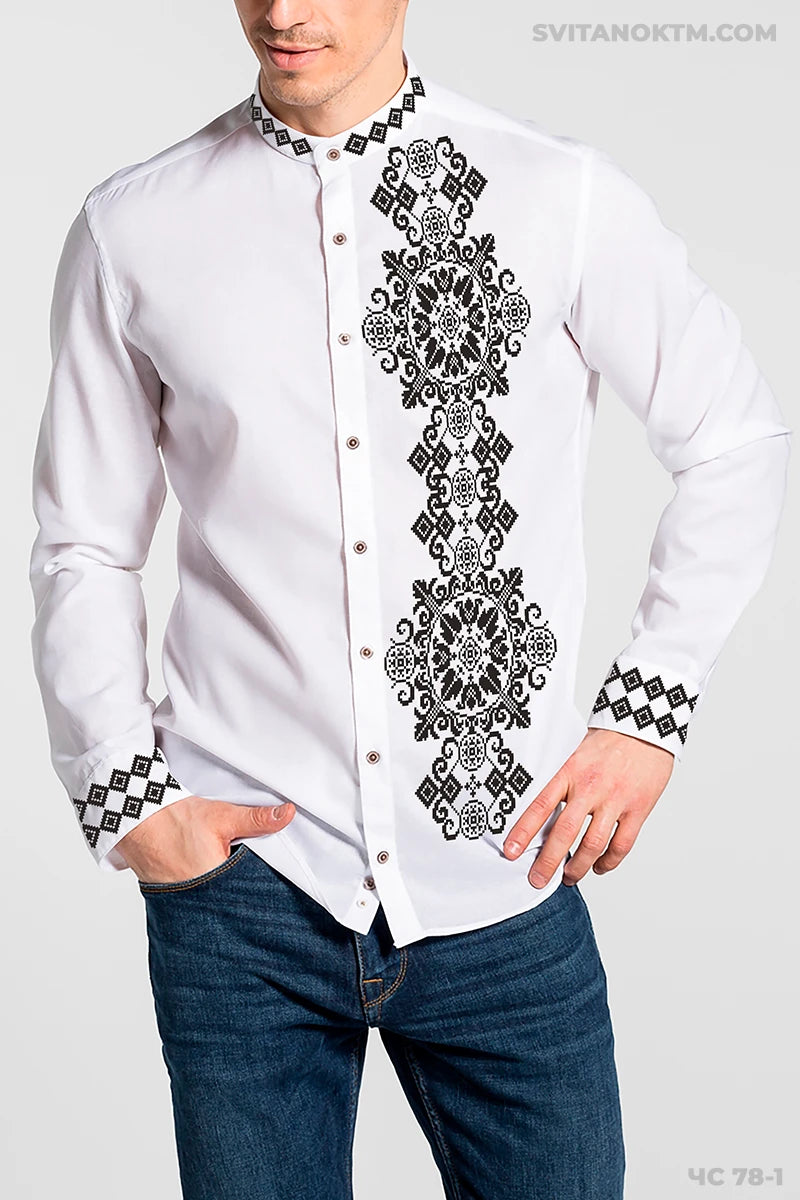 Не пошита заготовка для вишивки чоловічої сорочки з чорним геометричним орнаментом. Ідеальний варіант для створення унікальної чоловічої вишиванки у традиційному українському стилі. Підходить для вишивки бісером Preciosa або нитками DMC.