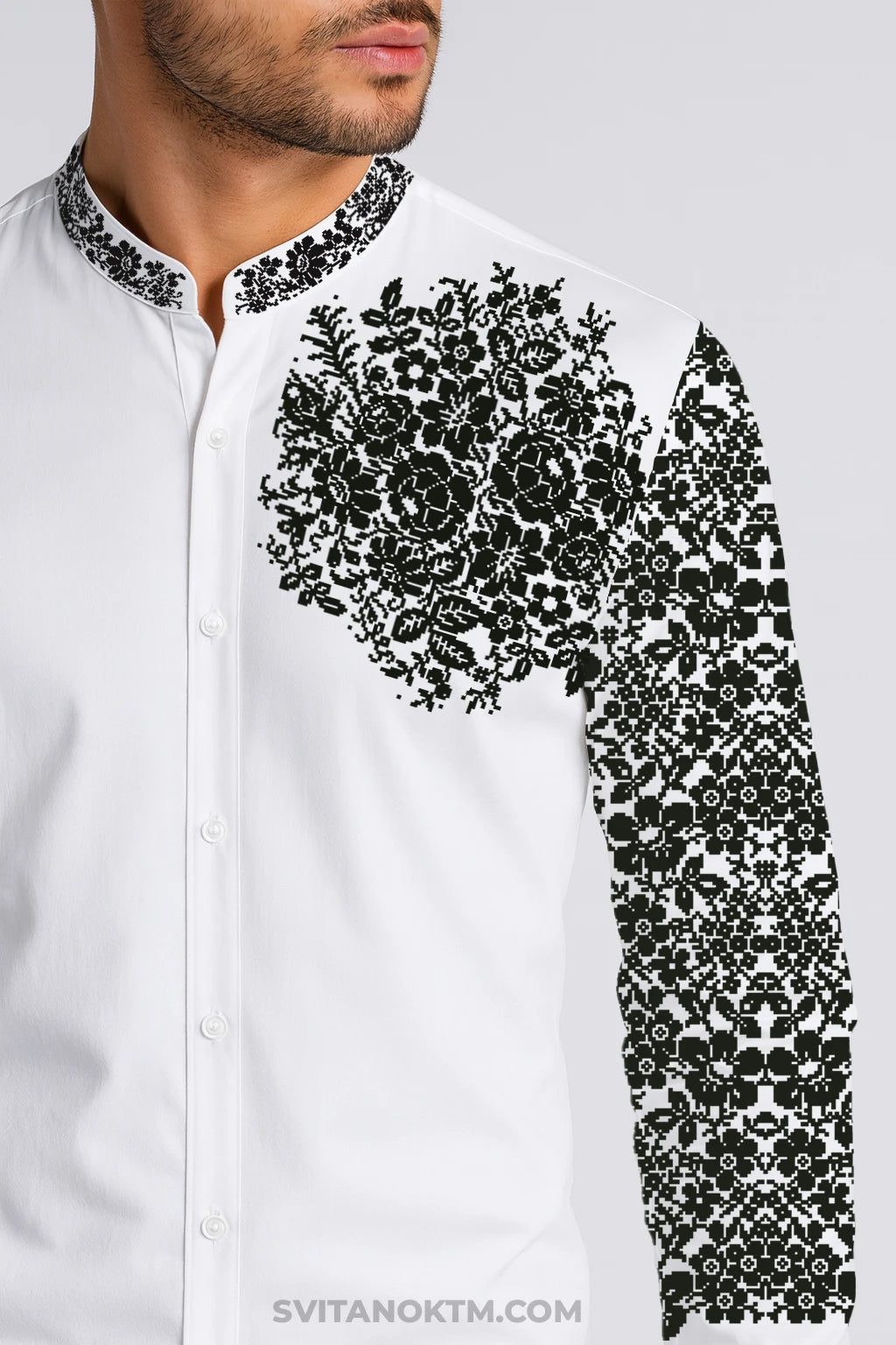 Чоловіча сорочка під вишивку з монохромним рослинним візерунком на рукаві та на грудях.