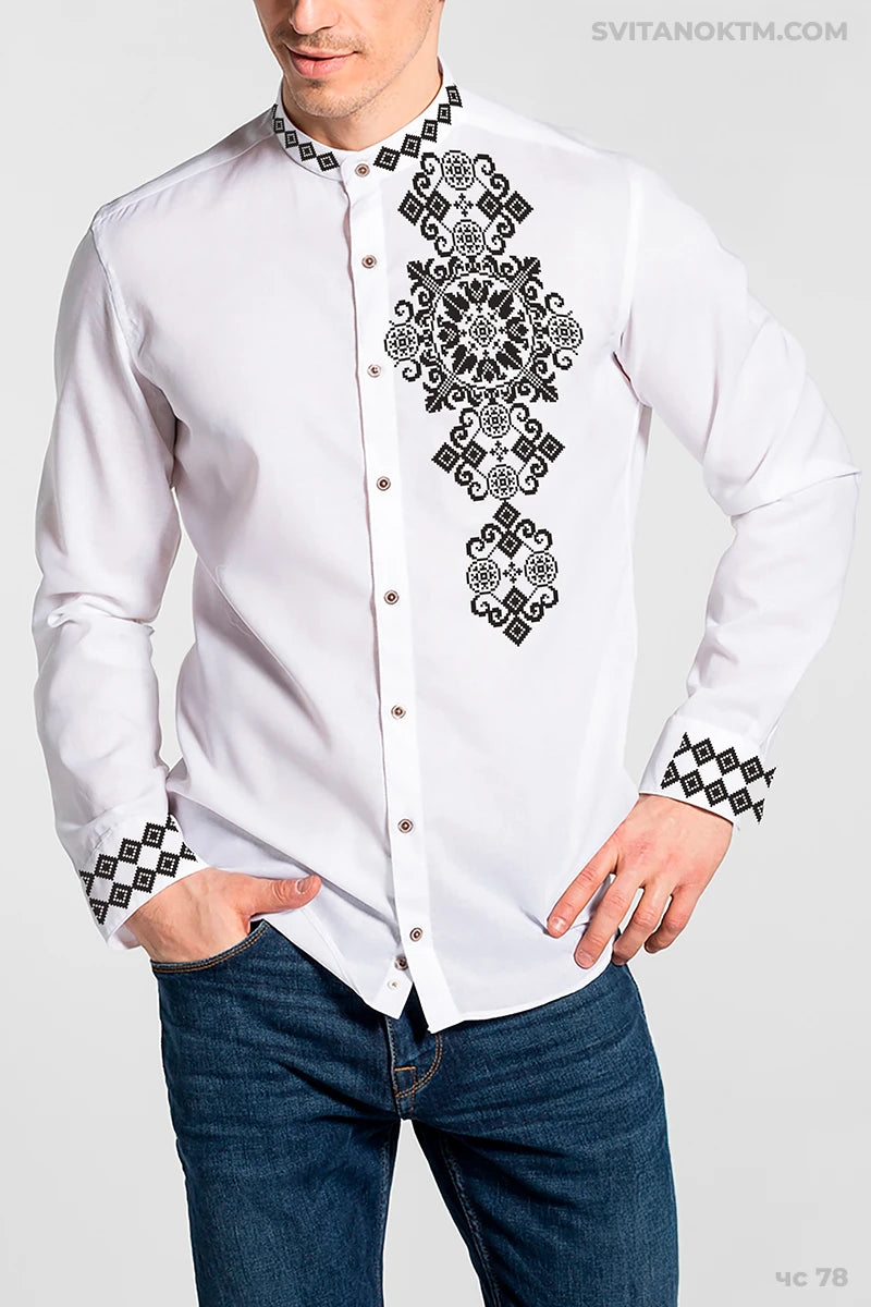 Не пошита заготовка для вишивки чоловічої сорочки з чорним геометричним орнаментом. Ідеальний варіант для створення унікальної чоловічої вишиванки у традиційному українському стилі. Підходить для вишивки бісером Preciosa або нитками DMC.