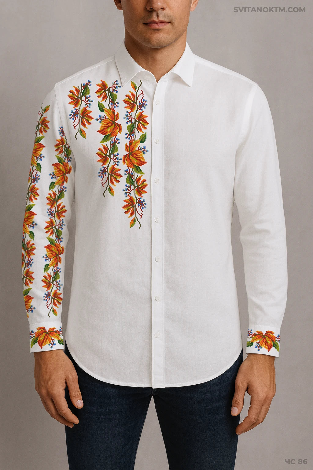 Чоловіча сорочка під вишивку. Головний акцент – лоза дикого винограду з полум'яним листям, що спадає по поличці та рукаві.