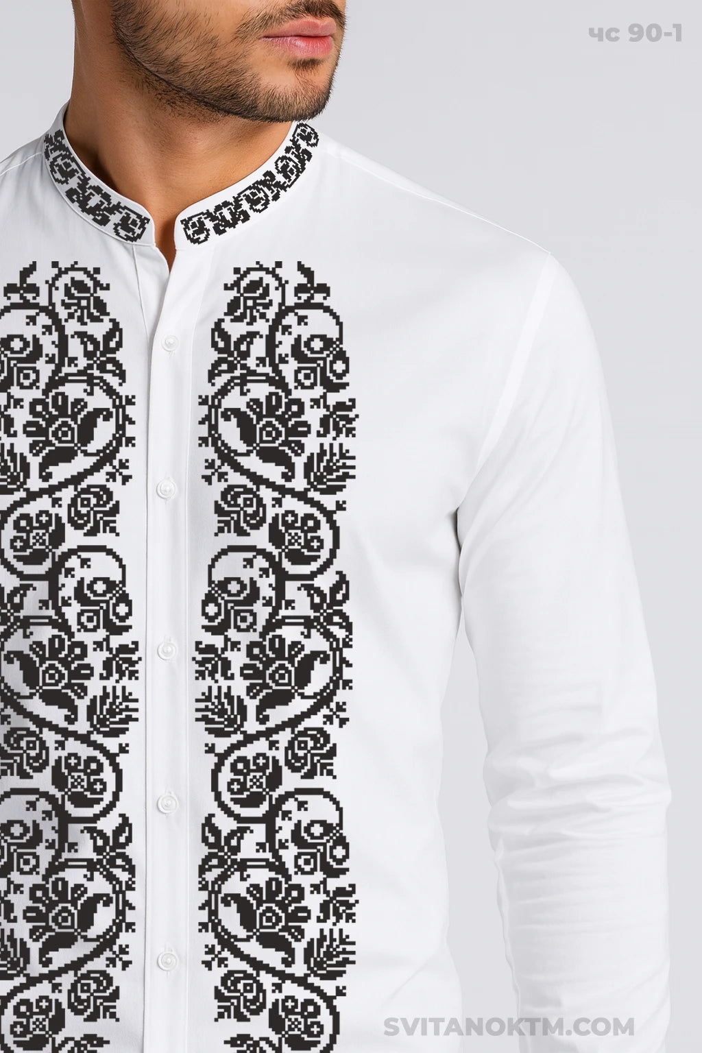 Чоловіча сорочка під вишивку. Головний акцент – монохромні квіти, що розташовані на грудях і рукаві.