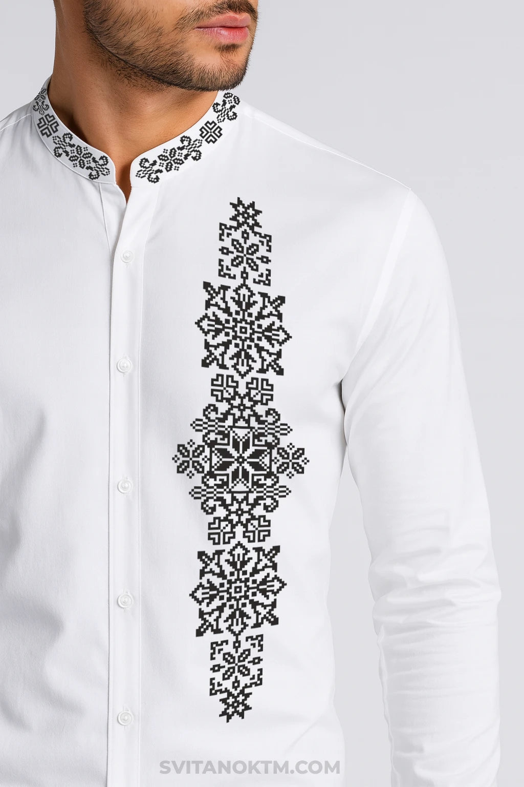 Не пошита заготовка для вишивки чоловічої сорочки з мінімалістичним орнаментом. Ідеальний варіант для створення унікальної чоловічої вишиванки у традиційному українському стилі. Підходить для вишивки бісером Preciosa або нитками DMC.